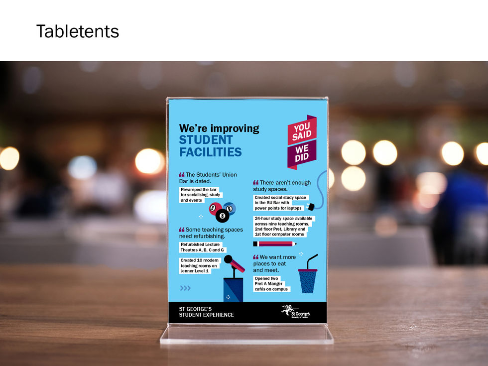 In 2017 St George’s produced a student experience initiative which tied together how St George’s has improved the student experience and how students can help the University make further progress. A direct result of the project is the “You Said / We Did” results campaign of 2018. This is the showcases the vocal student feedback on issues/problems they identified and highlights the areas in which improvements were made.